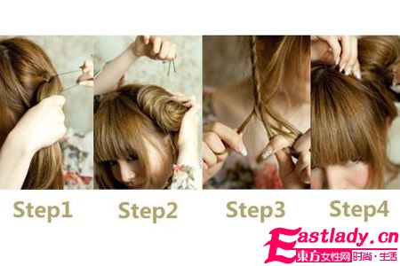 STEP4:将剩下的头发做成侧花苞头,再用辫子绕在外侧,用夹子固定,最后调整外造型。